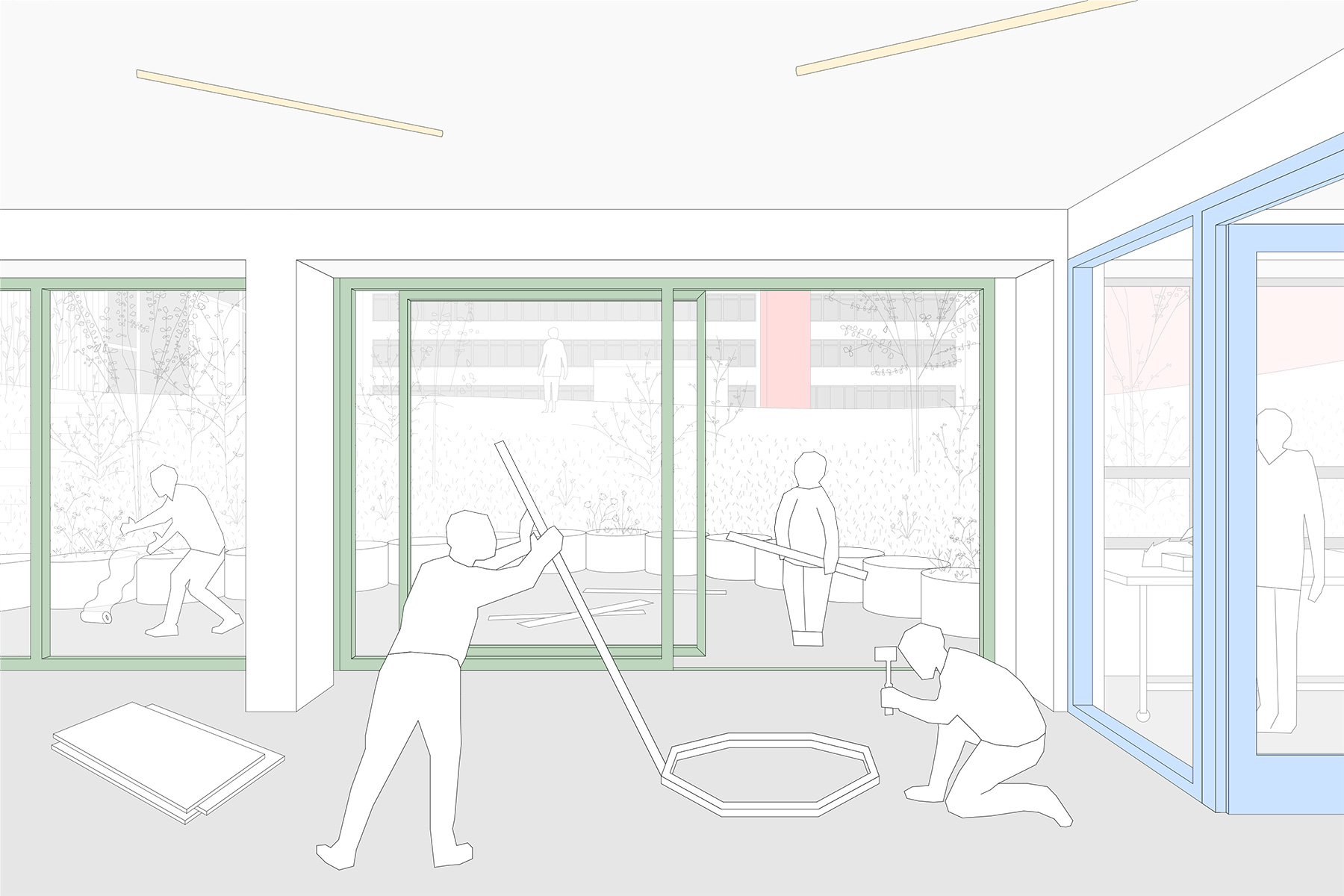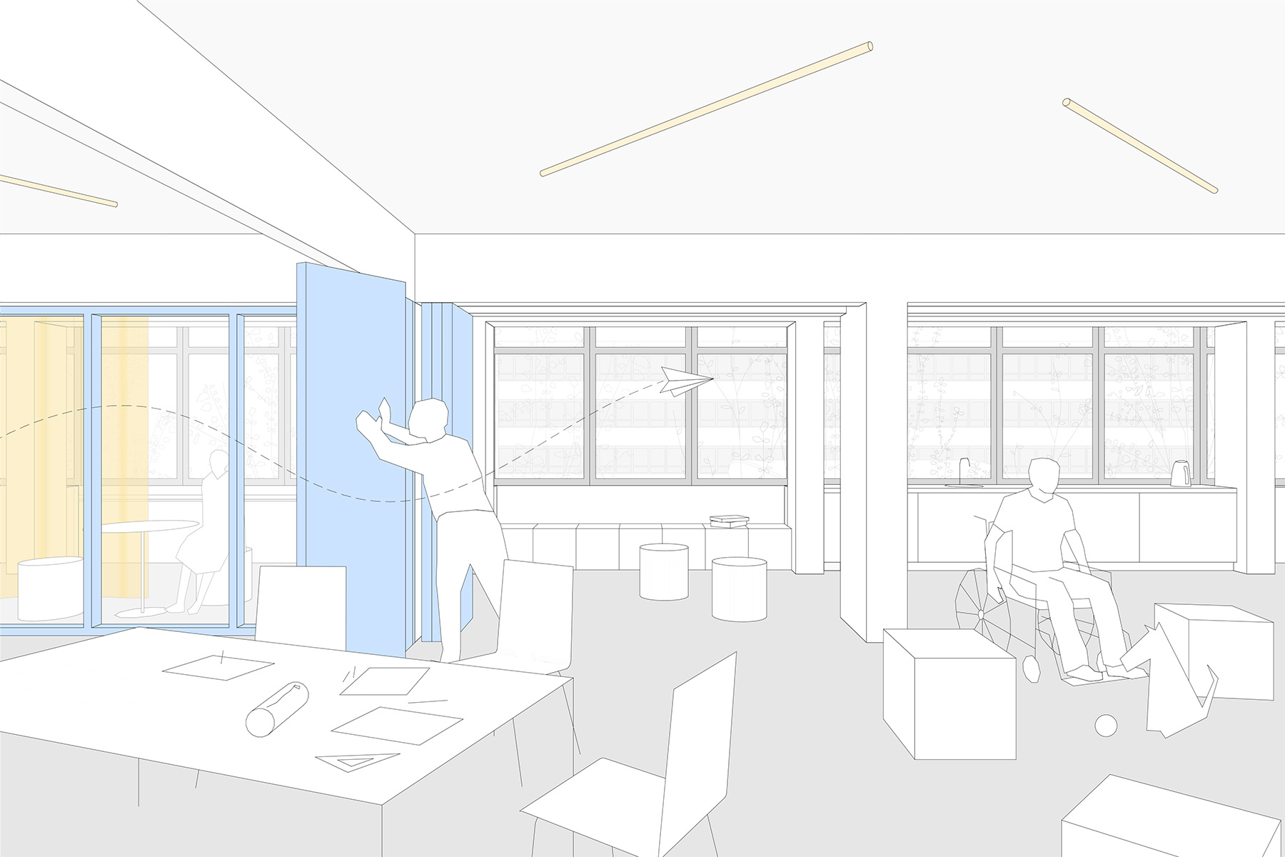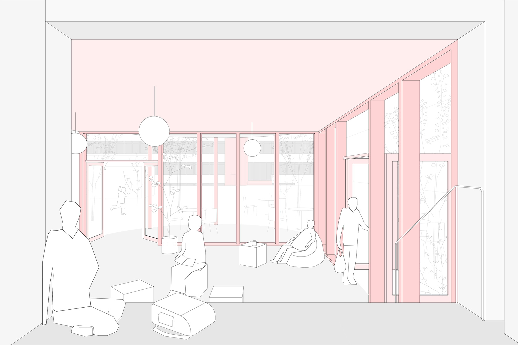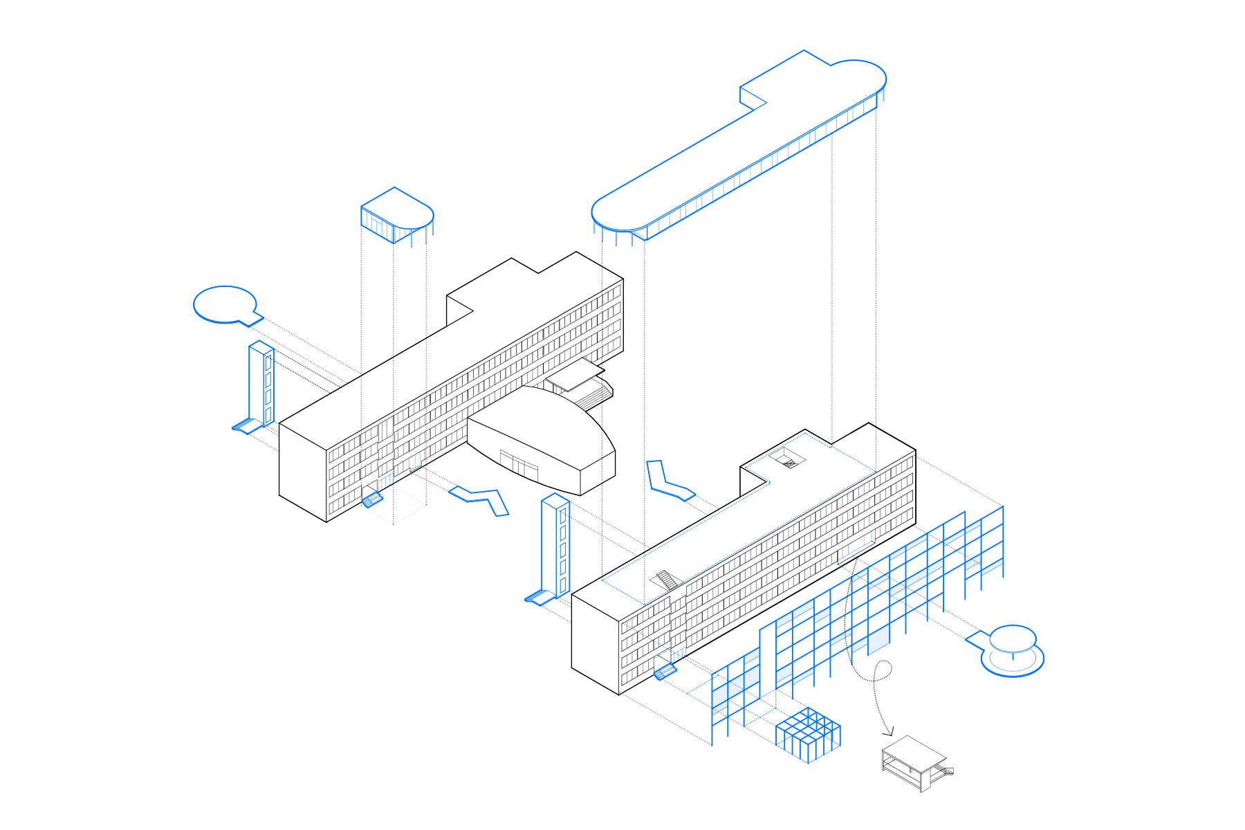 Die beiden uniformen Typenbauten werden in spezifische, multifunktionale, langfristig nutz- und anpassbare Gebäude verwandelt, die den Lehr- und Lernmethoden der ESBZ sowohl im Schulalltag, als auch zukünftigen, sich entwickelnden und wachsenden Lernkonzepten, offenstehen.