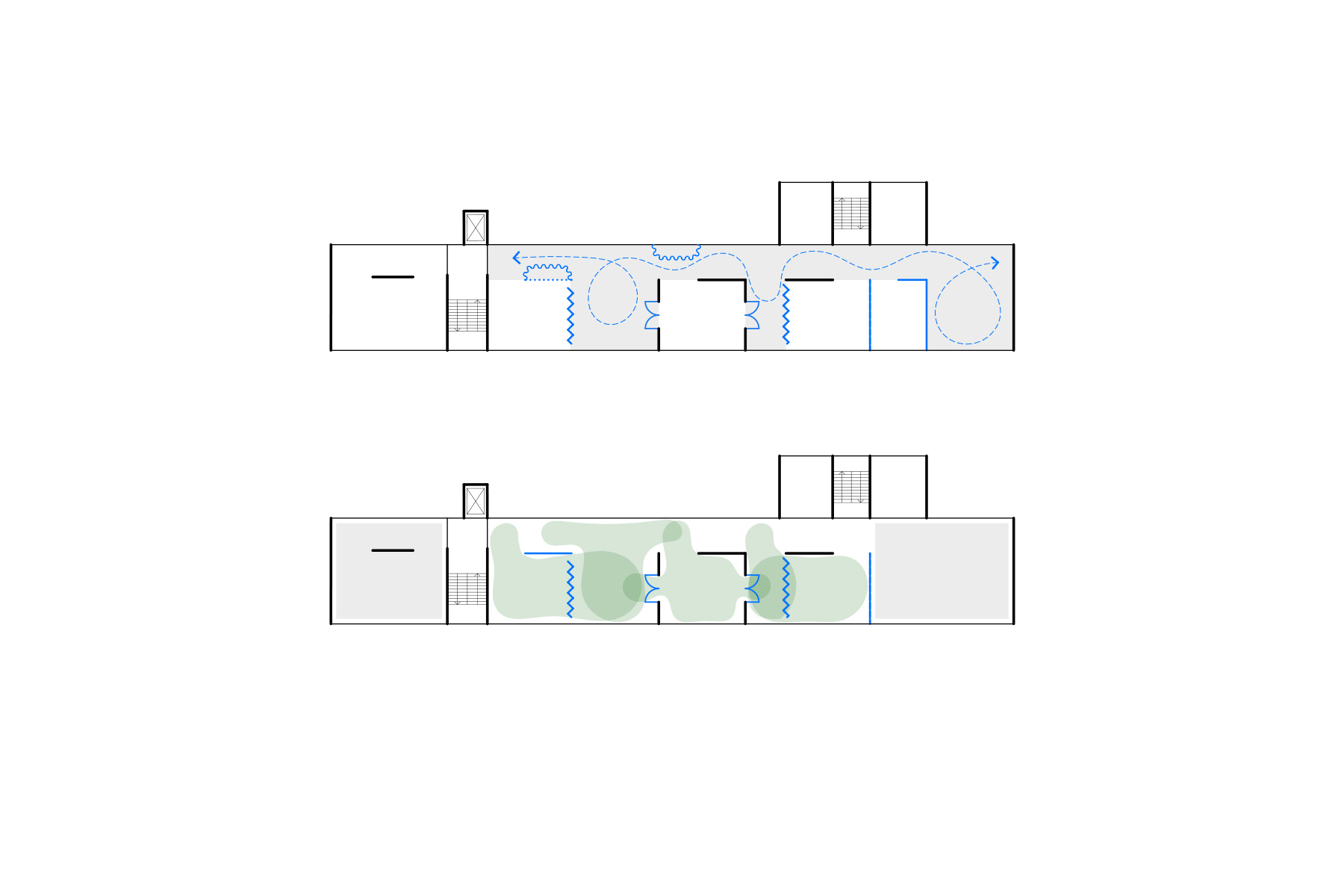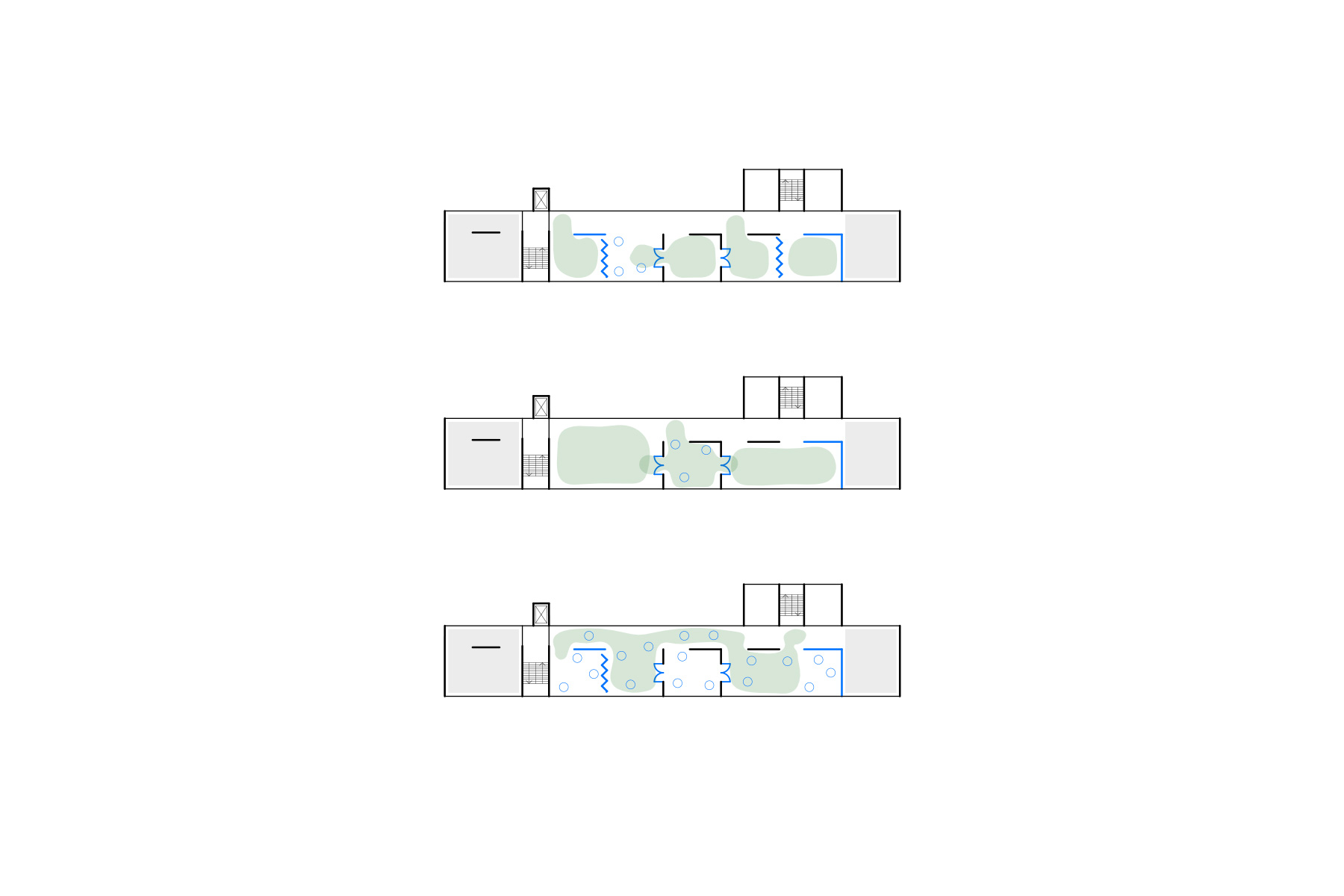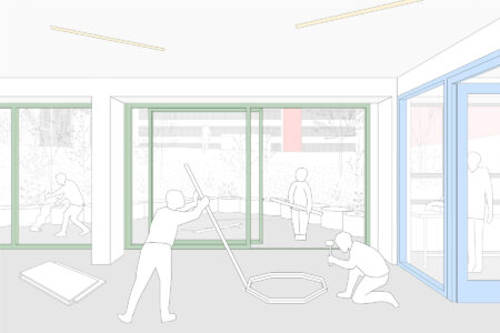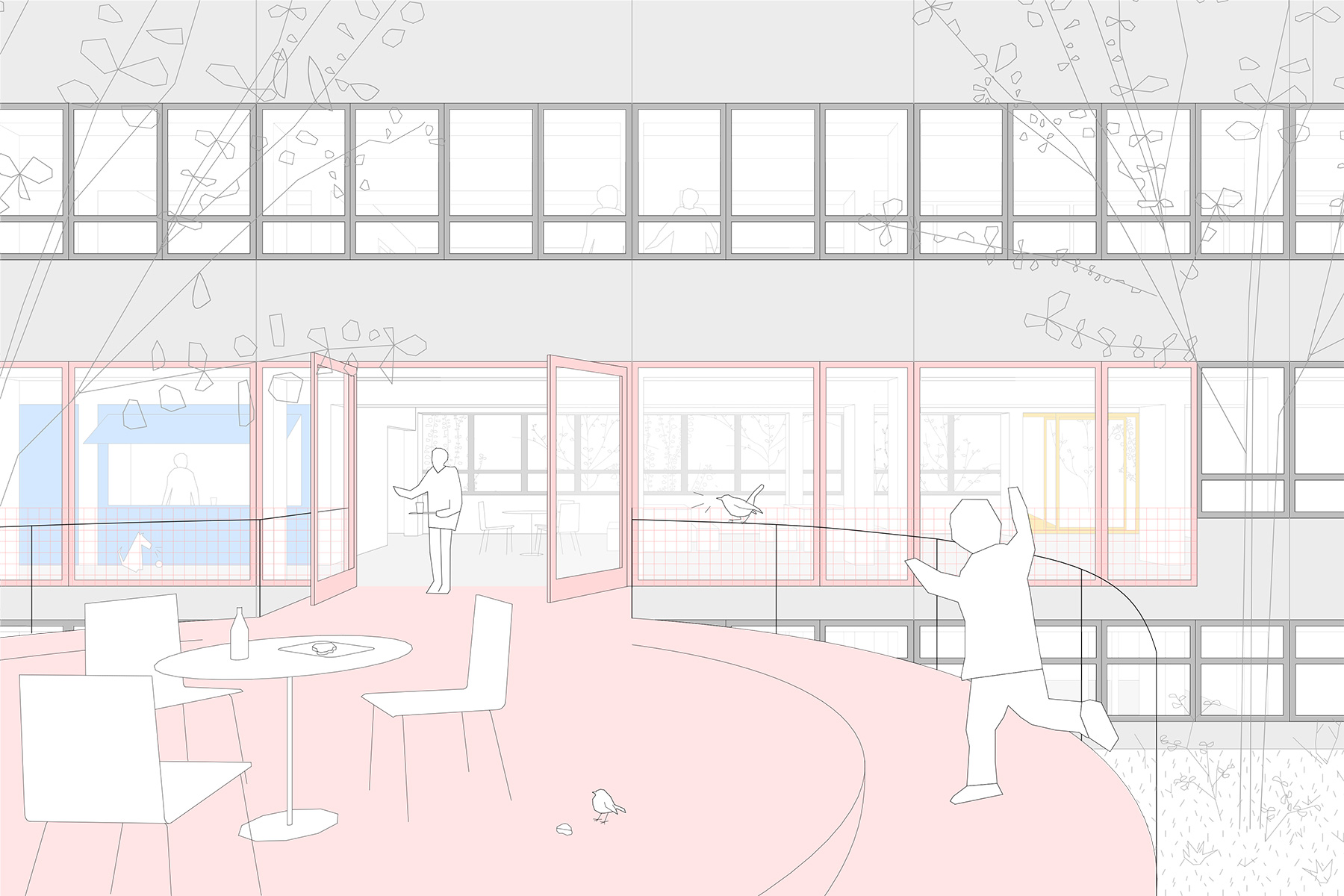 Dabei verfolgen wir 3 Strategien: In einem ersten Schritt öffnen wir die Gebäudestruktur und erhöhen die Möglichkeiten für Aneignung, Flexibilität und Veränderung, im zweiten vernetzen wir die Häuser untereinander, mit der Stadt und zu den Freiräumen, und bauen sie im letzten Schritt weiter um fehlende Raumpotentiale und Eigenschaften zu ergänzen.