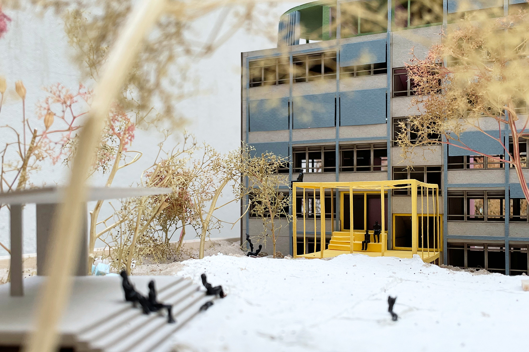 Die Evangelische Schule Berlin Zentrum (ESBZ) wurde im Jahr 2007 aus einer Elterninitiative heraus gegründet und ist in zwei Typenbauten der Reihe Berlin SK aus den 1970er Jahren untergebracht. Das besondere pädagogische Konzept und die wachsende Anzahl an Schüler*innen machen Umstrukturierung und Sanierung der Bestandsgebäude notwendig. Sie ist derzeit in zwei von drei Zeilen eines Plattenbau- Ensembles untergebracht.